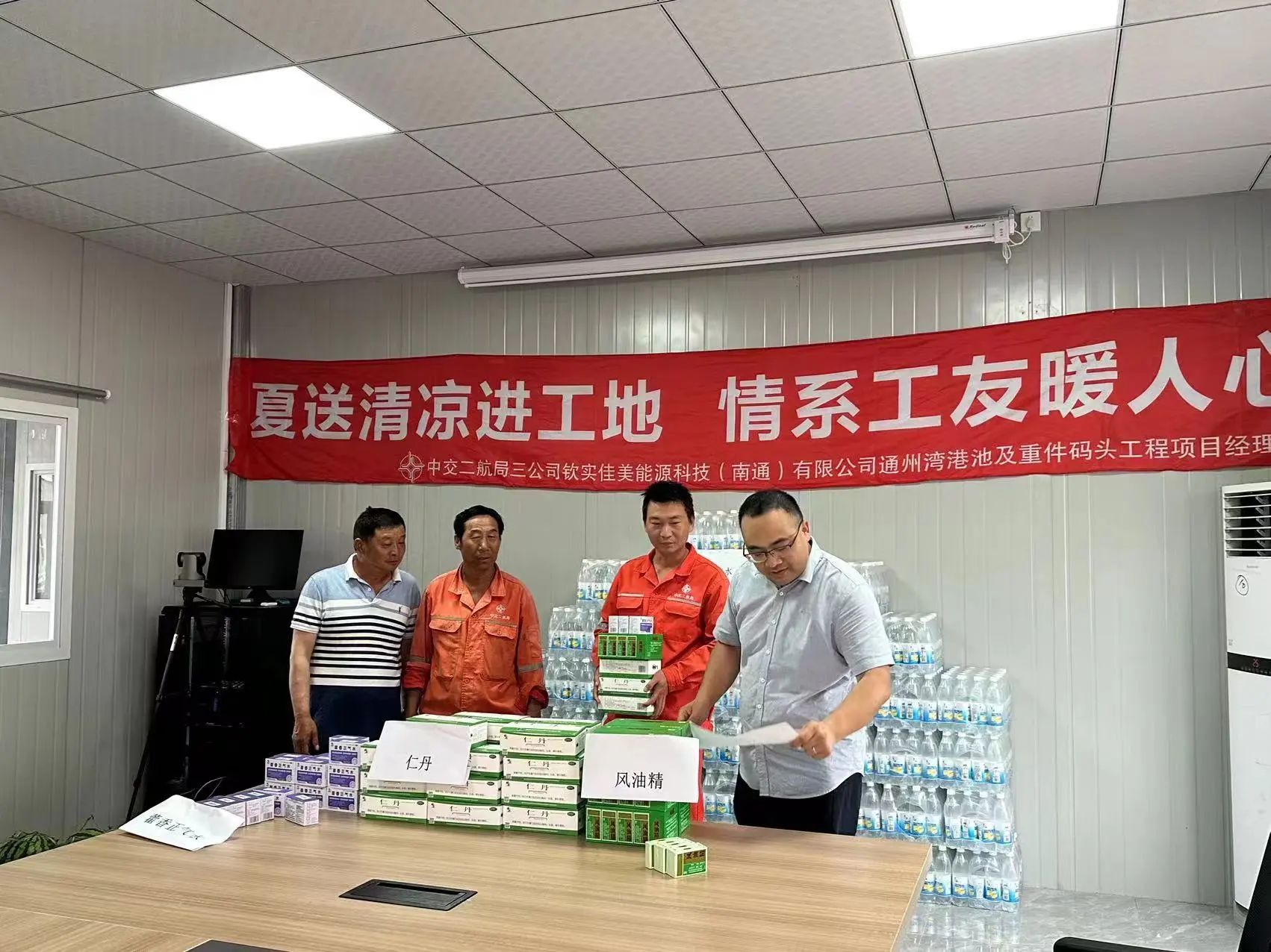 7月7日,,,,,,,,钦实通州湾码头项目部开展了“夏送清凉进工地,,,,,,,,情系工友暖人心”的高温慰问运动,,,,,,,,旨在向一线事情者表达眷注与支持,,,,,,,,并宣传清静生产知识,,,,,,,,确保高温天气下的清静作业。。。。。。