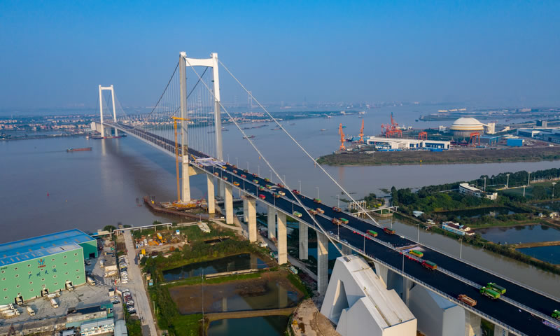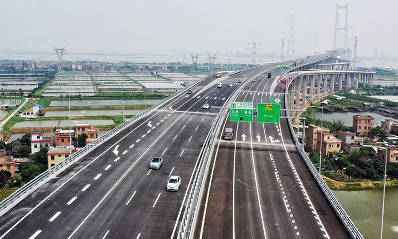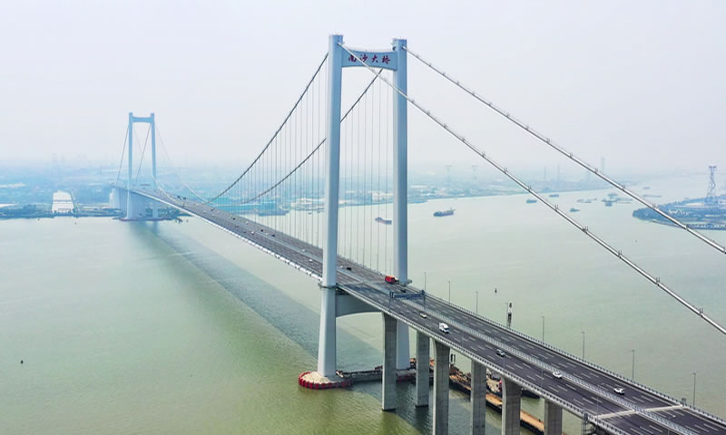 广州南沙大桥(原名虎门二桥)设计全长12.9公里,,,,,是珠三角焦点区内主要的过江通道。。。。。。建成后突破了珠江口两岸只有一个通道的“瓶颈”。。。。。。工程起点位于广州市南沙区东涌镇,,,,,与珠江三角洲经济区环形公路南环段对接,,,,,沿线跨越珠江大沙水道、海鸥岛、珠江坭洲水道,,,,,终点位于东莞市沙田镇,,,,,与广深沿江高速公路毗连,,,,,含大沙水道桥、坭洲水道桥两座悬索桥。。。。。。接纳双向八车道的高速公路标准,,,,,设计时速100公里,,,,,桥梁宽度40.5米。。。。。。