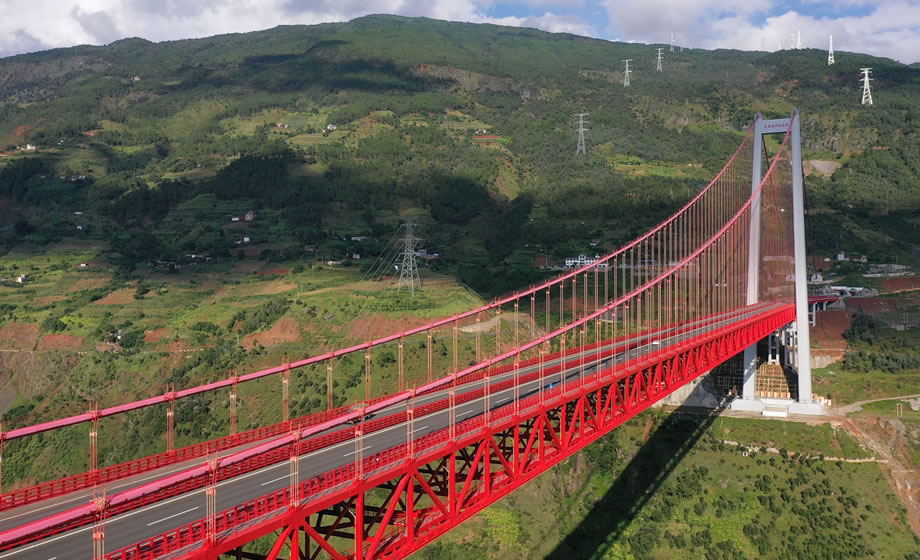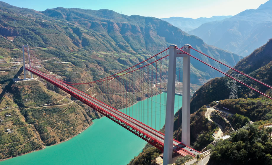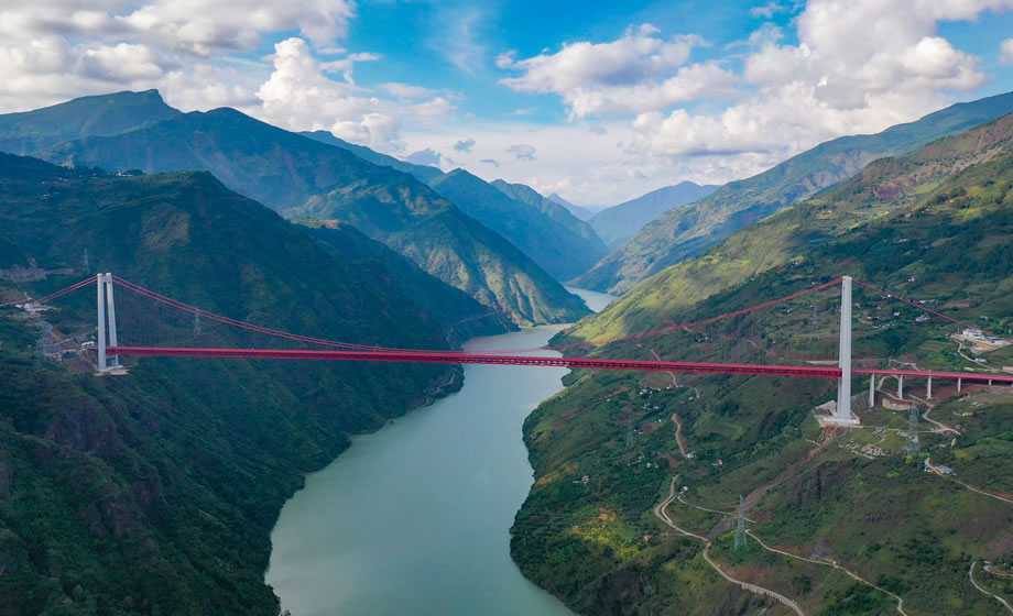 大桥横跨金沙江,,,,,犹如一道靓丽飞虹架设在高山峡谷和江水之间。。。。。大桥创下多项纪录:现在天下最大跨径山区悬索桥;;;;;;天下首座全桥接纳U肋全熔透焊接工艺的桥梁;;;;;;桥面宽27米,,,,,跨径1386米,,,,,宽度与跨径比达1/51,,,,,居天下第一;;;;;;钢桁梁吊装系统跨径达1386米,,,,,为现在天下桥梁领域最大跨径缆索吊。。。。。