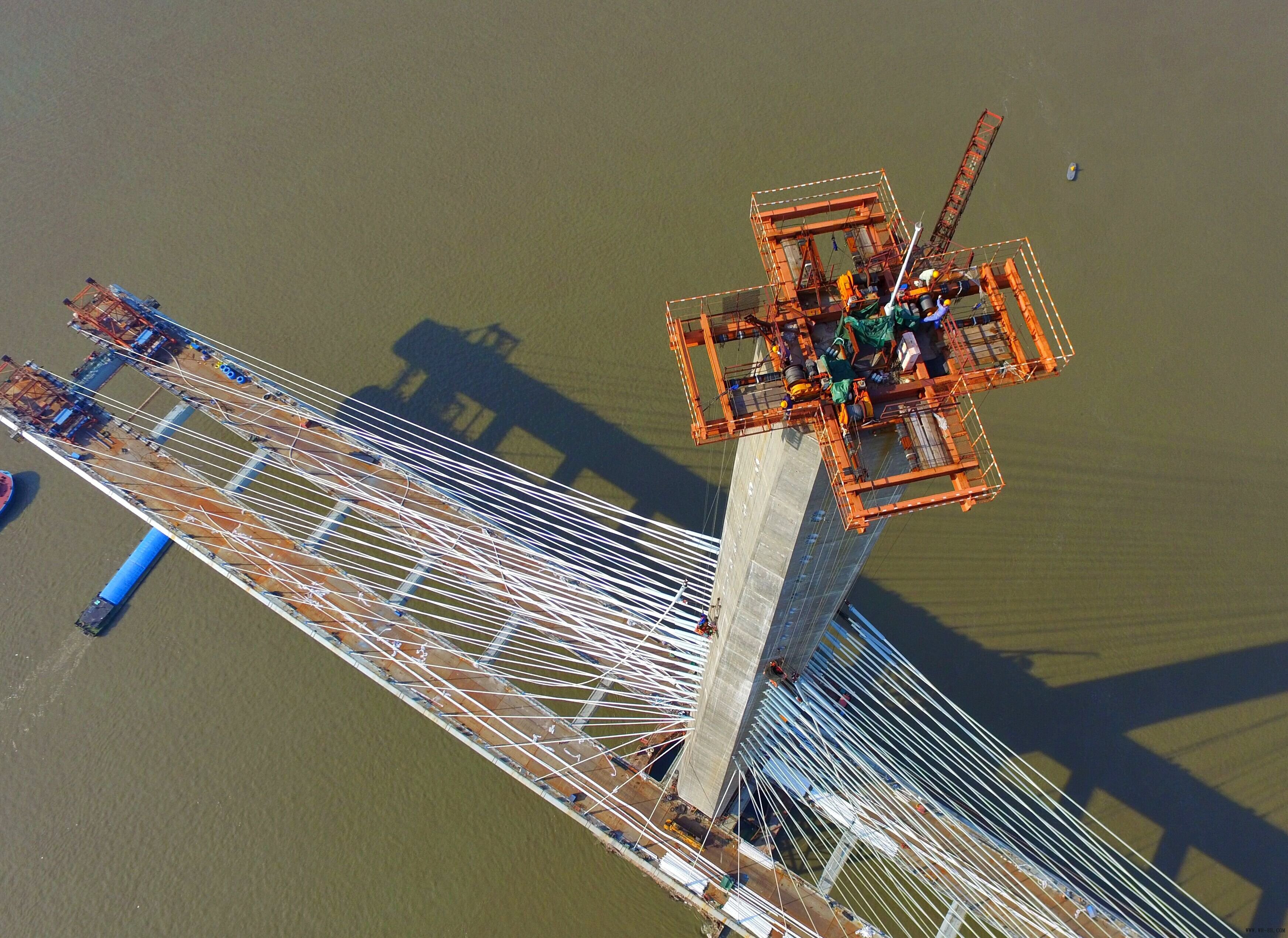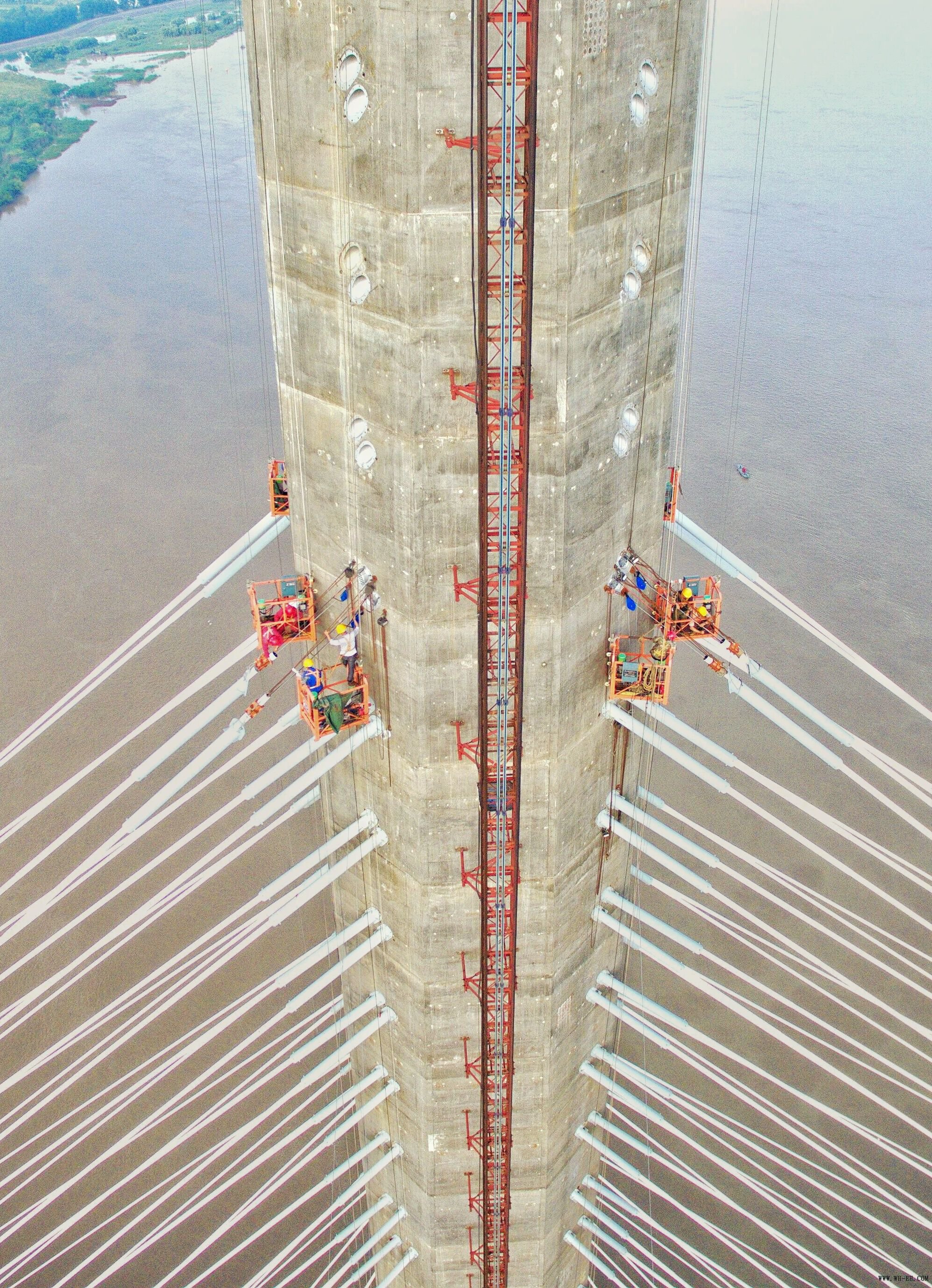 阻止7月25日,,,,,,斜拉索已完成16对,,,,,,尚有9对仍在全力组织攻关。。。。。图为桥工在262米的高塔上举行穿索施工。。。。。