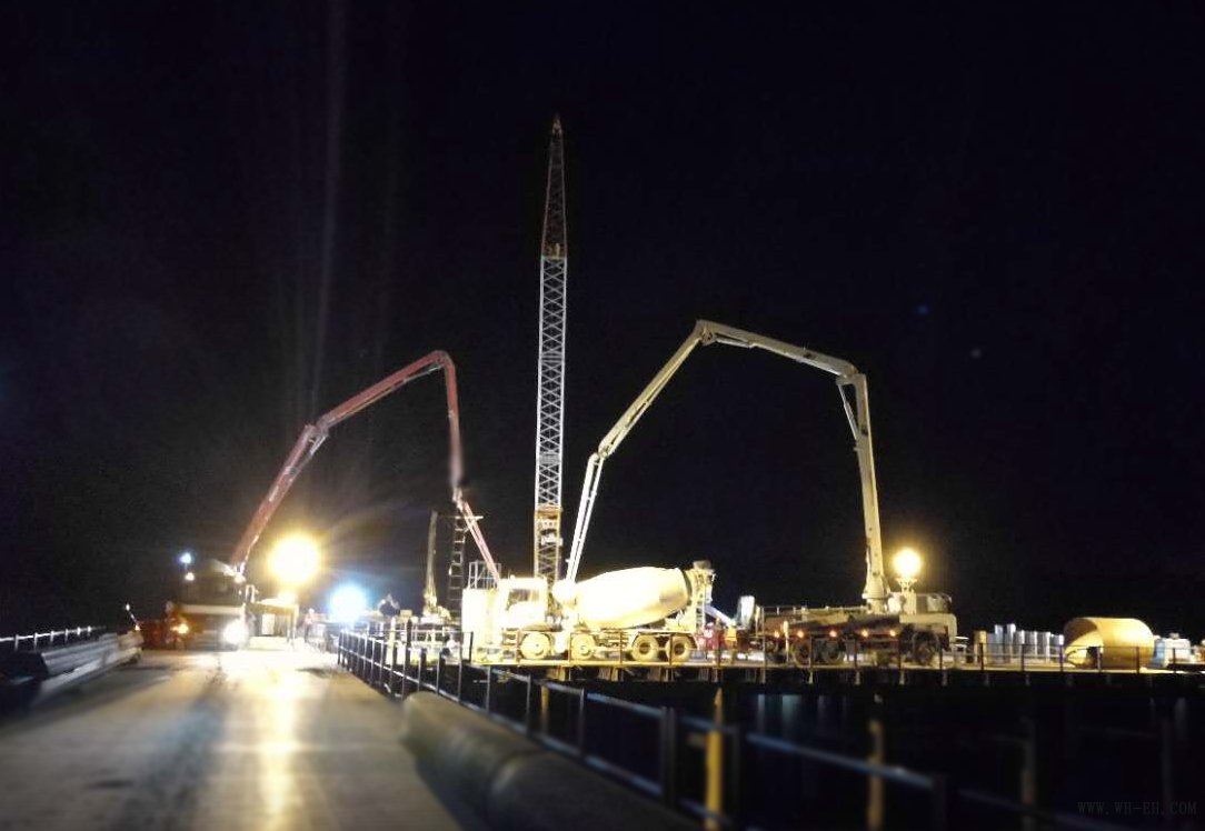 本项目主墩接纳钢板桩围堰,,,,,,,,钢板桩接纳PU22型板桩,,,,,,,,90度转角处使用C14板桩,,,,,,,,均自带配套锁扣用于密封止水。。。。。。自8月下旬最先,,,,,,,,历时18天,,,,,,,,完成北主墩施工平台拆除和钢围堰施事情业。。。。。。历时7天,,,,,,,,完成挖泥和封底前的准备事情。。。。。。北主墩封底厚度为2.0米,,,,,,,,水下封底1.7米,,,,,,,,抽水、割除护筒后,,,,,,,,找平0.3米,,,,,,,,总方量约为1200立方米。。。。。。此次封底施工设置12个布料点,,,,,,,,2台泵车浇筑混凝土,,,,,,,,南北侧两个工地搅拌站举行供料,,,,,,,,1台50吨履带吊,,,,,,,,10辆混凝土罐车配合施工。。。。。。