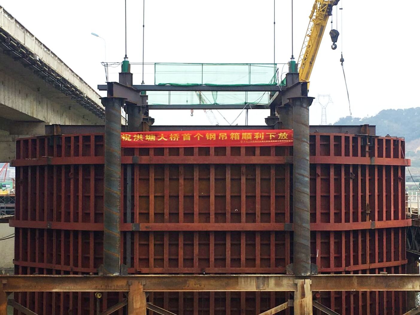 福州洪塘大桥拓宽改建工程总长约2.2公里,,,,,,接纳保流通建设。。。。。。先建两侧新桥,,,,,,然后拆除老桥,,,,,,再建中心剩余部分形成整幅桥梁,,,,,,最终实现新洪塘大桥双向八车道通行。。。。。。邻近春节,,,,,,此次钢吊箱施工更是受到了各方的高度重视,,,,,,顺遂下放的效果也激励了项目部全体,,,,,,在保清静、保质量的条件下,,,,,,提前结构工序转换,,,,,,马上组织承台封底施工,,,,,,为早日买通闽侯上街到福州市区的快速通道,,,,,,缓解交通压力孝顺力量。。。。。。