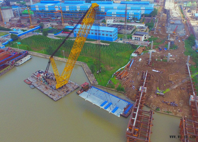 本次吊装的为运河大桥第一节下层桥面板,,,,,,,,长35米,,,,,,,,重132吨,,,,,,,,接纳600吨浮吊船举行吊装。。。。。。为确保水深大于浮吊船最小吃水深度,,,,,,,,桥梁施工队首先对吊装区域举行了航道清淤处置惩罚。。。。。。钢桁梁块体在钢厂内制造并在厂内举行预拼,,,,,,,,后经水路运输至桥位举行装置。。。。。。