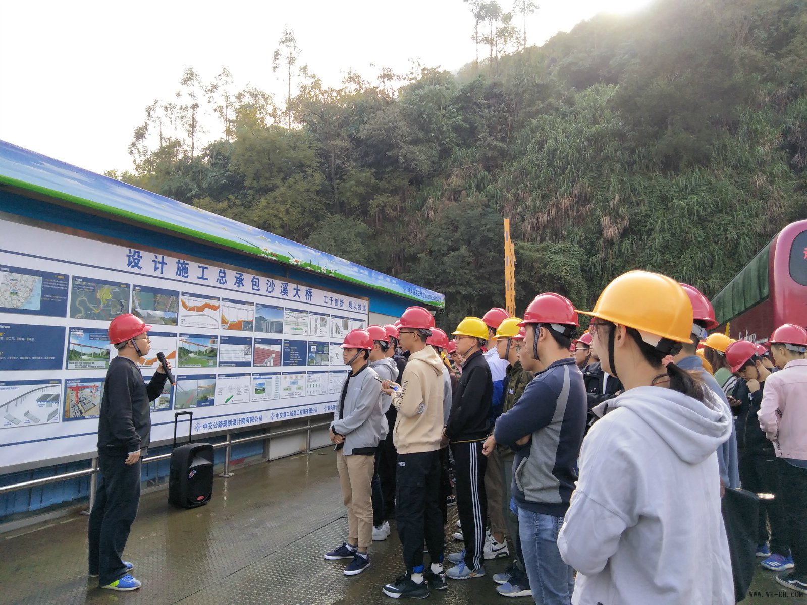 10月31日上午 , ,,,, ,,,三明学院修建工程学院土木匠程系100余名学生在先生的向导下 , ,,,, ,,,到莆炎高速三明段YA20施工项目部栈桥旅行学习。。 。。。。