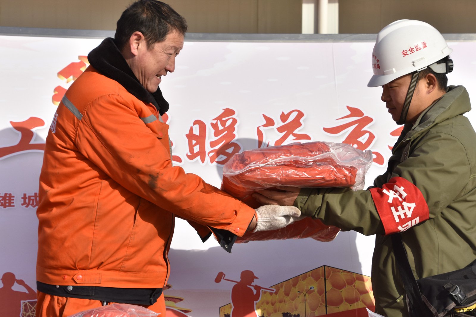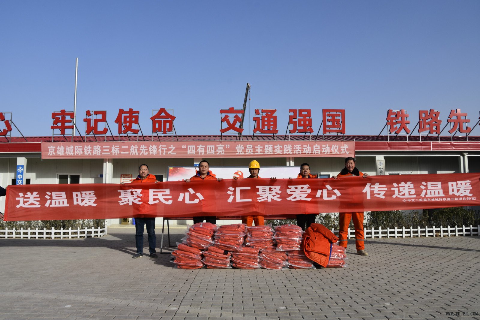 入冬以来,,,,,,,华北地区寒流来袭,,,,,,,地处京津冀地区的京雄城际铁路施工现场已零下五度,,,,,,,地表温度更低,,,,,,,一线作业职员依然日夜坚守在岗位上。。。。。。。。为了使这个冬天不再严寒,,,,,,,克日项目部给各作业班组职员送去棉服,,,,,,,为冬日里支付辛勤劳动的一线职员送去眷注和温暖,,,,,,,此次送温暖运动项目部办公室发1000来件棉衣给劳务作业职员手中。。。。。。。。