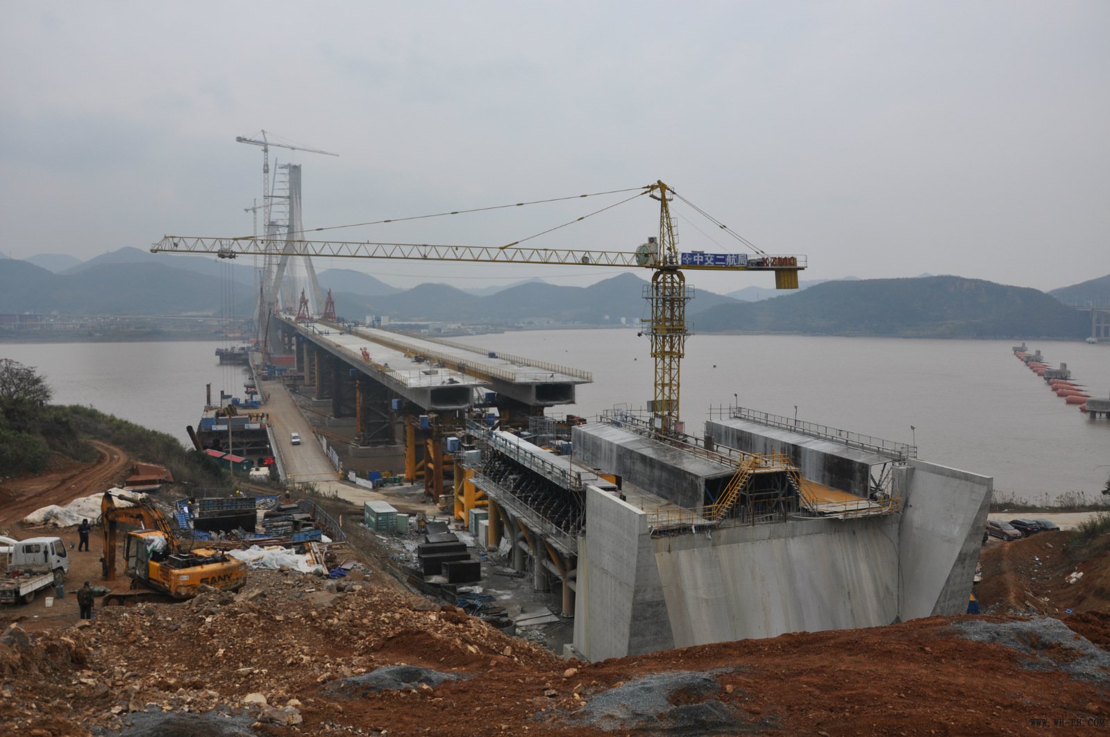 引桥接纳的是仿生学活动式顶推施工工艺 。。。。。。顶推分为左右幅,,,,,,, ,单幅总质量9242.51吨,,,,,,, ,跨度达330米长 。。。。。。云云大跨度深海域超重混凝土活动式顶推在海内施工尚属首次 。。。。。。
