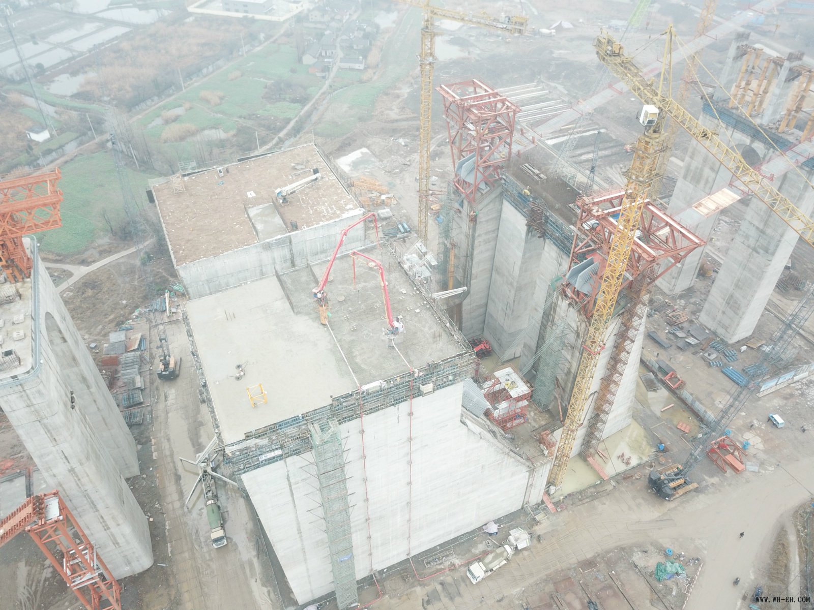 五峰山大桥北锚碇锚块分为上下游两个部分,,,,,高度偏向分18节,,,,,单次最大方量4100方,,,,,总计13.5万方混凝土。。。。。。锚块施工看似简朴,,,,,但由于体积重大,,,,,接纳翻模施工,,,,,其模板定位很是难题。。。。。。为包管工程质量和职员清静,,,,,仅模板牢靠支架就用去300吨型钢。。。。。。