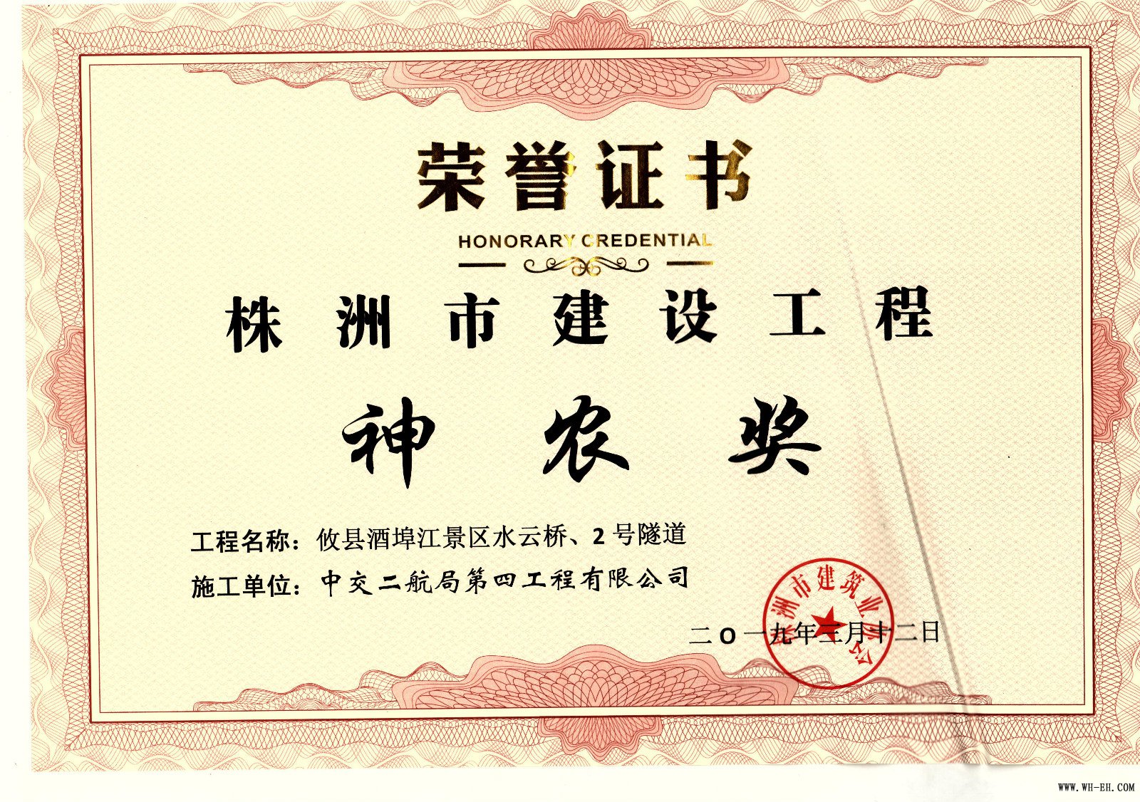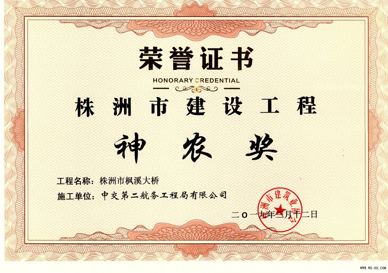克日,,,,,,,,株洲市住建局宣布了关于2017-2018年度《株洲市建设工程神农奖》名单,,,,,,,,由公司承建的株洲枫溪大桥、攸县酒埠江景区水云桥及2号隧道工程项目喜获该项声誉。。 。。 。 。。。
