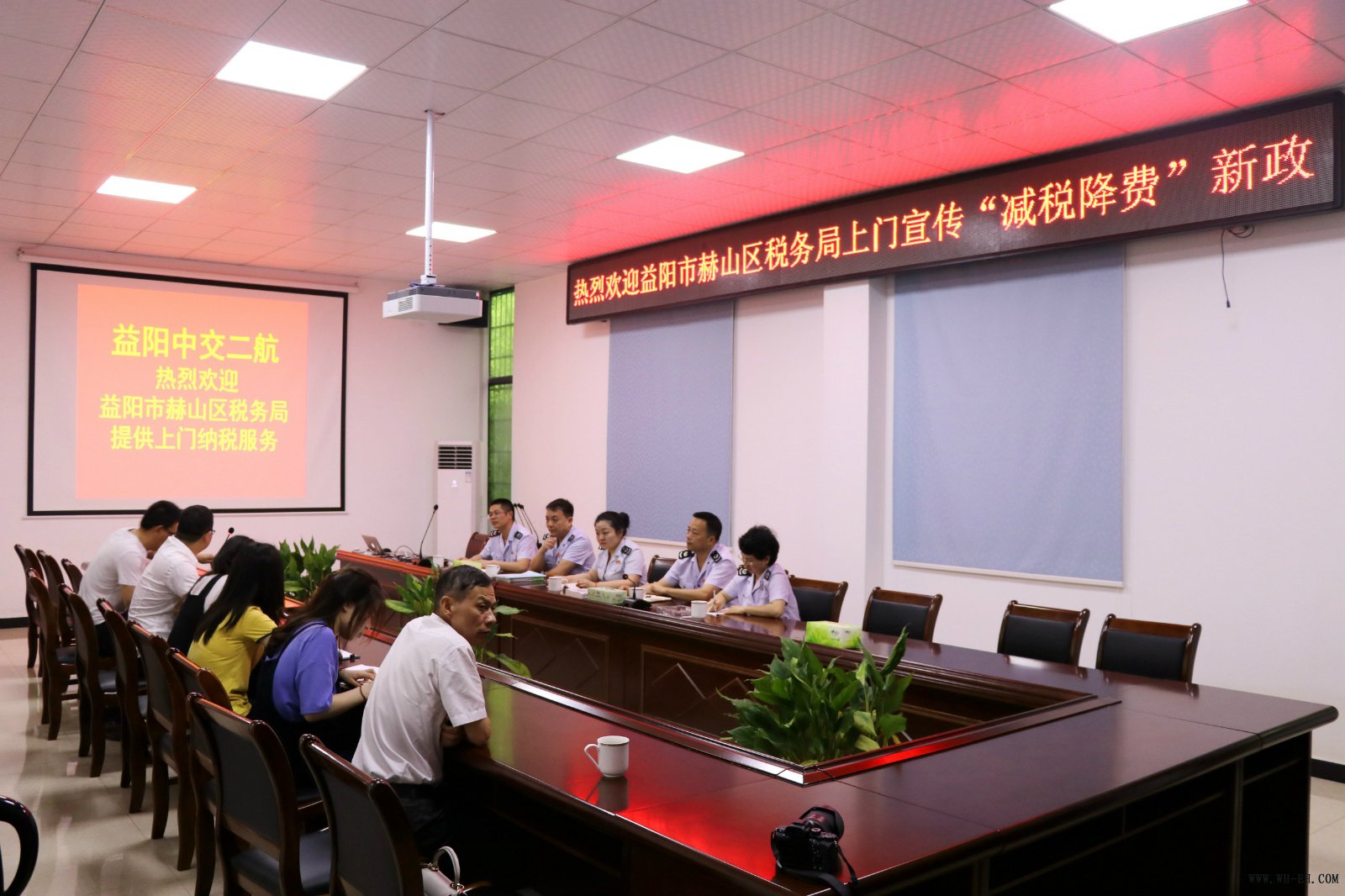 5月26日,,,,,,益阳市赫山区国税局副局长徐立辉一行6人,,,,,,到市重点工程项目——益阳市资江风貌带,,,,,,上门宣传国家“减税降费”新政,,,,,,并为该企业提供个性化、定制化的纳税服务,,,,,,为企业释放实着实在的刷新盈利。。。。。。