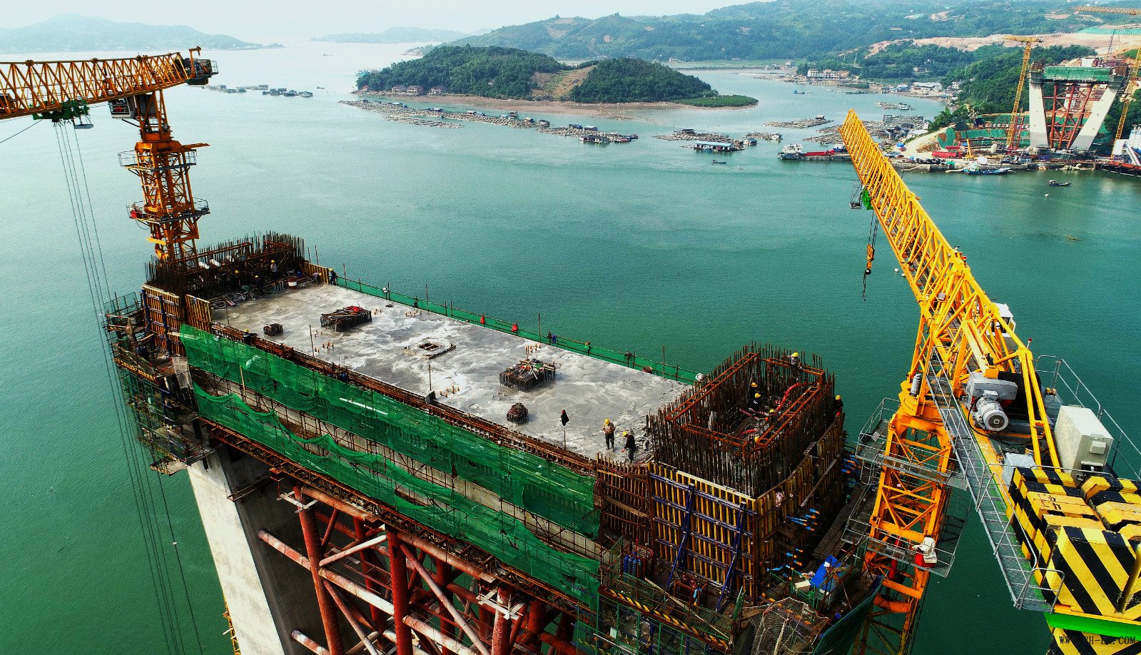 沙埕湾跨海大桥7号墩主塔为钻石型塔柱,,,,,塔高192.2米,,,,,分为44节段,,,,,标准节段高4.5米。。。。。。。。其中下横梁位于第11节段和第12节段之间,,,,,是主塔建设历程中单项单次工程耗时最长,,,,,事情量最大的一次施工。。。。。。。。下横梁为预应力混凝土结构,,,,,高7米,,,,,宽9.5米,,,,,壁厚1米,,,,,接纳落地支架法施工,,,,,分两层与对应节段塔柱同步浇注成型,,,,,单次浇筑混凝土615方。。。。。。。。