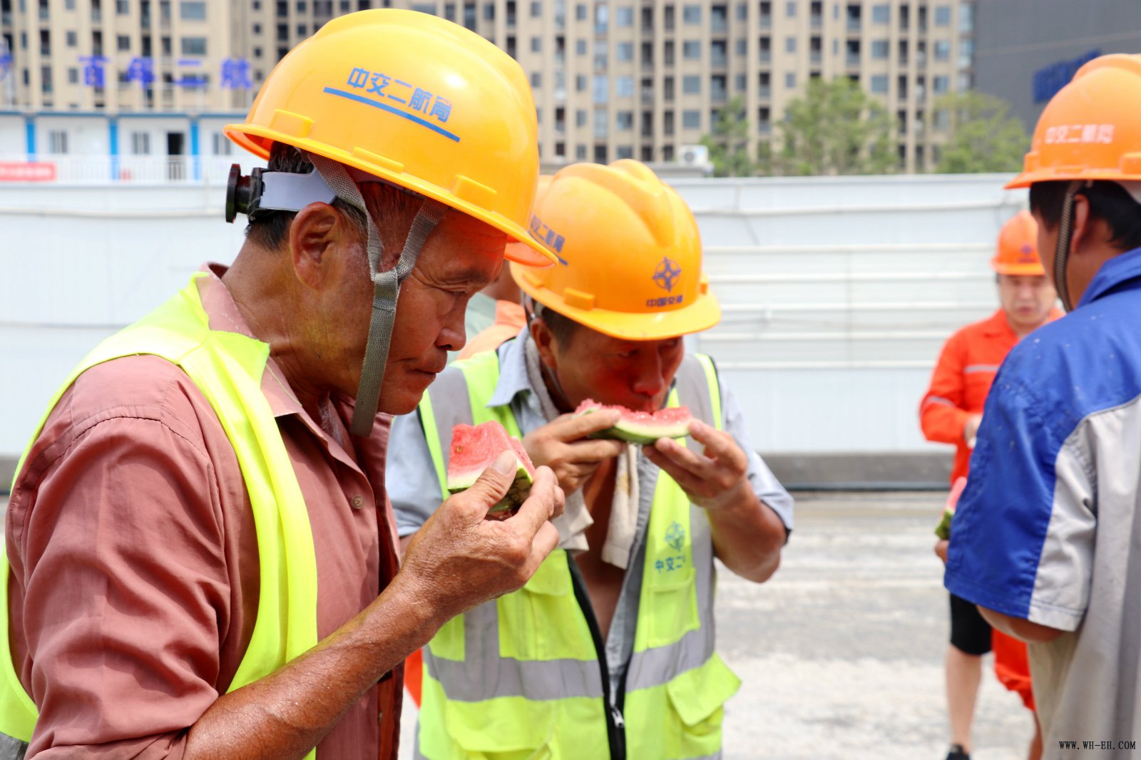 “西瓜真甜 , ,,,,,上午喝绿豆汤下昼吃西瓜 , ,,,,,随着二航局干活福利就是好 , ,,,,,得劲。。。 。。。。”路基认真人老王一边吃着适口的西瓜一边笑嘻嘻地说。。。 。。。。