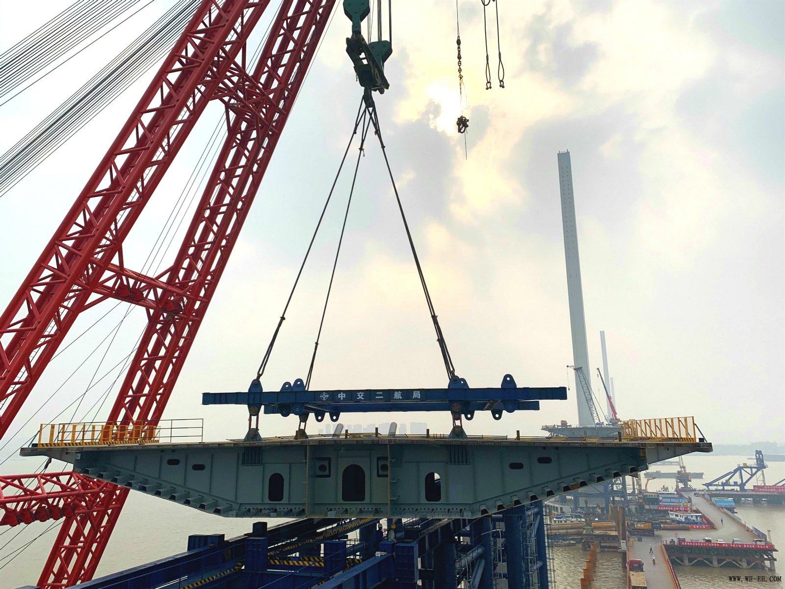 此次吊装的边跨首节梁段桥面板接纳粗骨料活性粉末混凝土制作,,,,,,,,为流线型扁平整体箱型组合梁。 。。。 。粗骨料活性粉末混凝土是新一代水泥基质料,,,,,,,,拥有高强度、高延性、高耐久性三大特点以及卓越的力学性能,,,,,,,,不但大大减轻了桥梁的重量,,,,,,,,并且解决了钢桥面板易疲劳开裂问题,,,,,,,,提高了钢桥面铺装沥青的耐久性,,,,,,,,行车恬静度更强,,,,,,,,也让桥梁使用寿命更长。 。。。 。