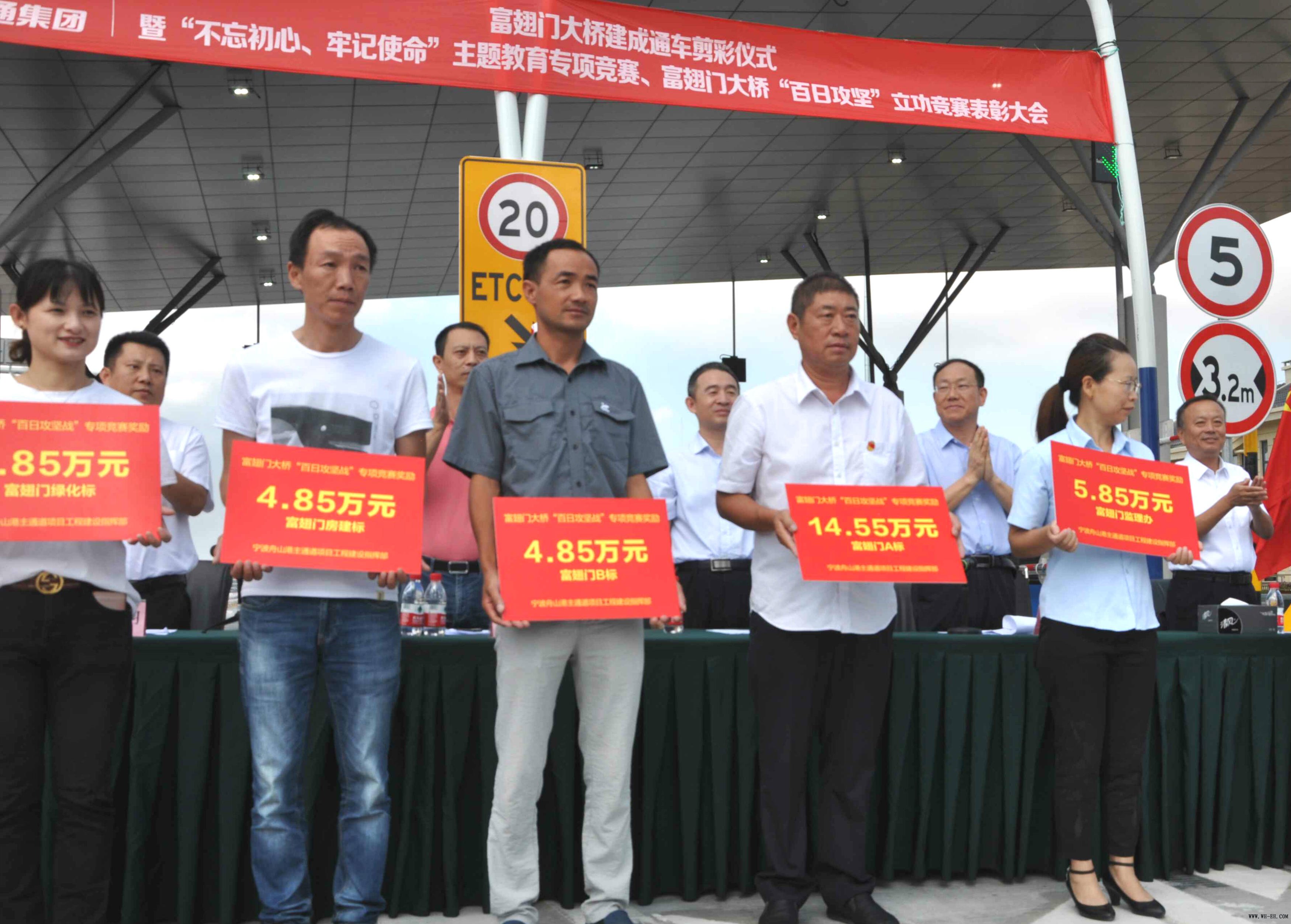 9月27日,,,,,,,舟山市富翅门大桥“百日攻坚”立功竞赛表扬大会在舟山西收费站外广场盛大举行。。。。。在本次表扬大会上,,,,,,,我项目部获得奖励金额14.55万元,,,,,,,在加入富翅门大桥工程建设的9个标段中位列第一名。。。。。
