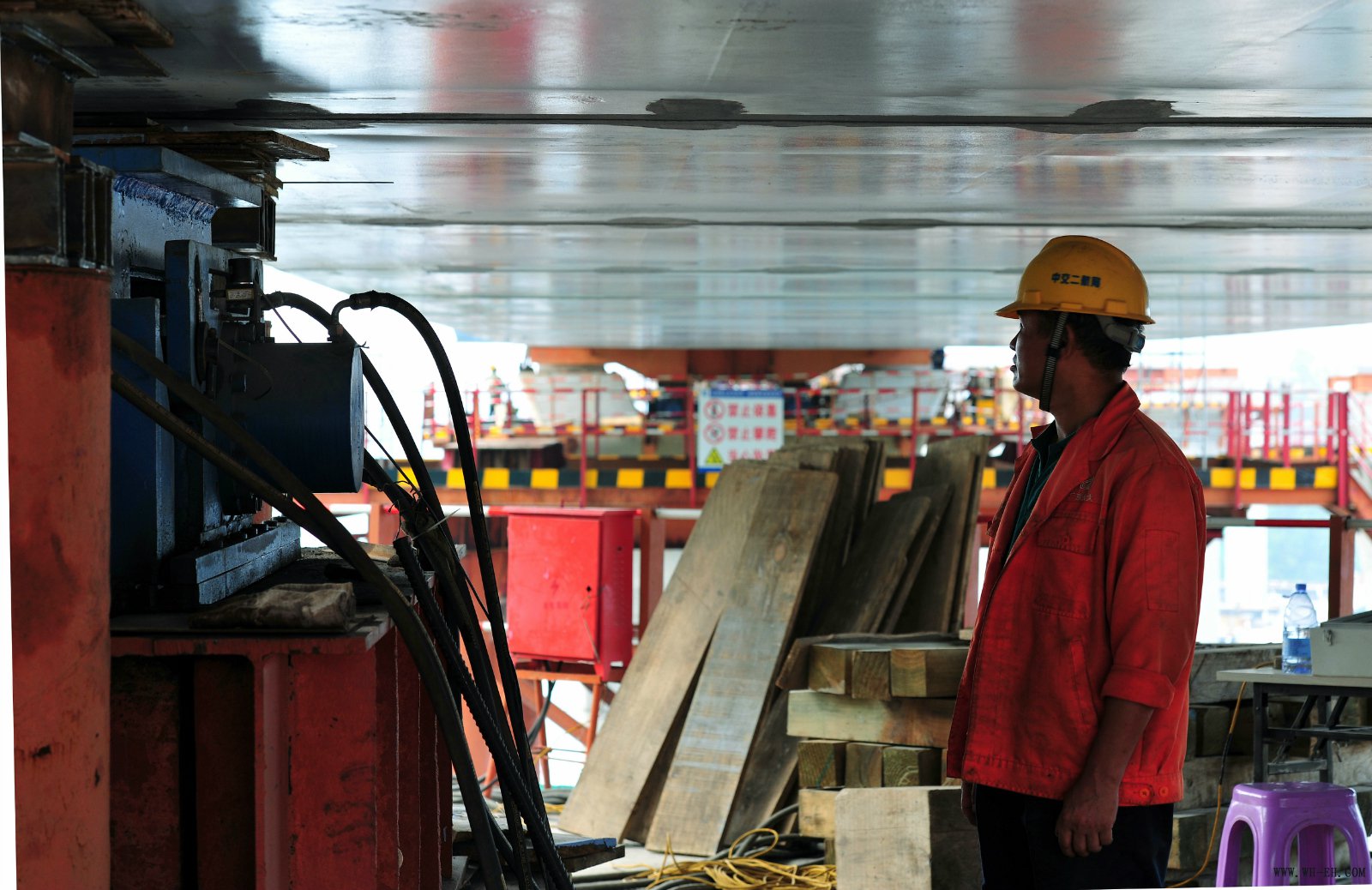 “这种步伐很省力 ,,, ,,我们只是简朴的操作。。。。。。。。”“在钢槽梁下面 ,,, ,,起风下雨都不怕。。。。。。。。”在顶推作业现场 ,,, ,,工人看着千斤顶 ,,, ,,听着油泵“滋滋”的声音 ,,, ,,显得很悠然 ,,, ,,甚至可以说说“闲话”。。。。。。。。