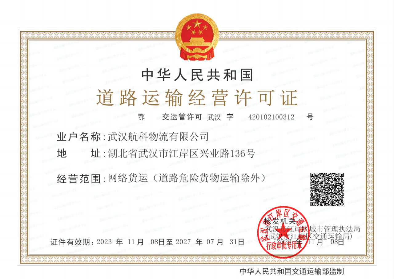 11月8日,,,,,航科物流公司乐成取得武汉市江岸区都会管理执法局(交通运输局)揭晓的蹊径运输谋划允许证,,,,,谋划规模网络货运,,,,,标记着公司网络货运平台建设迈出坚实一步。。。。。。。