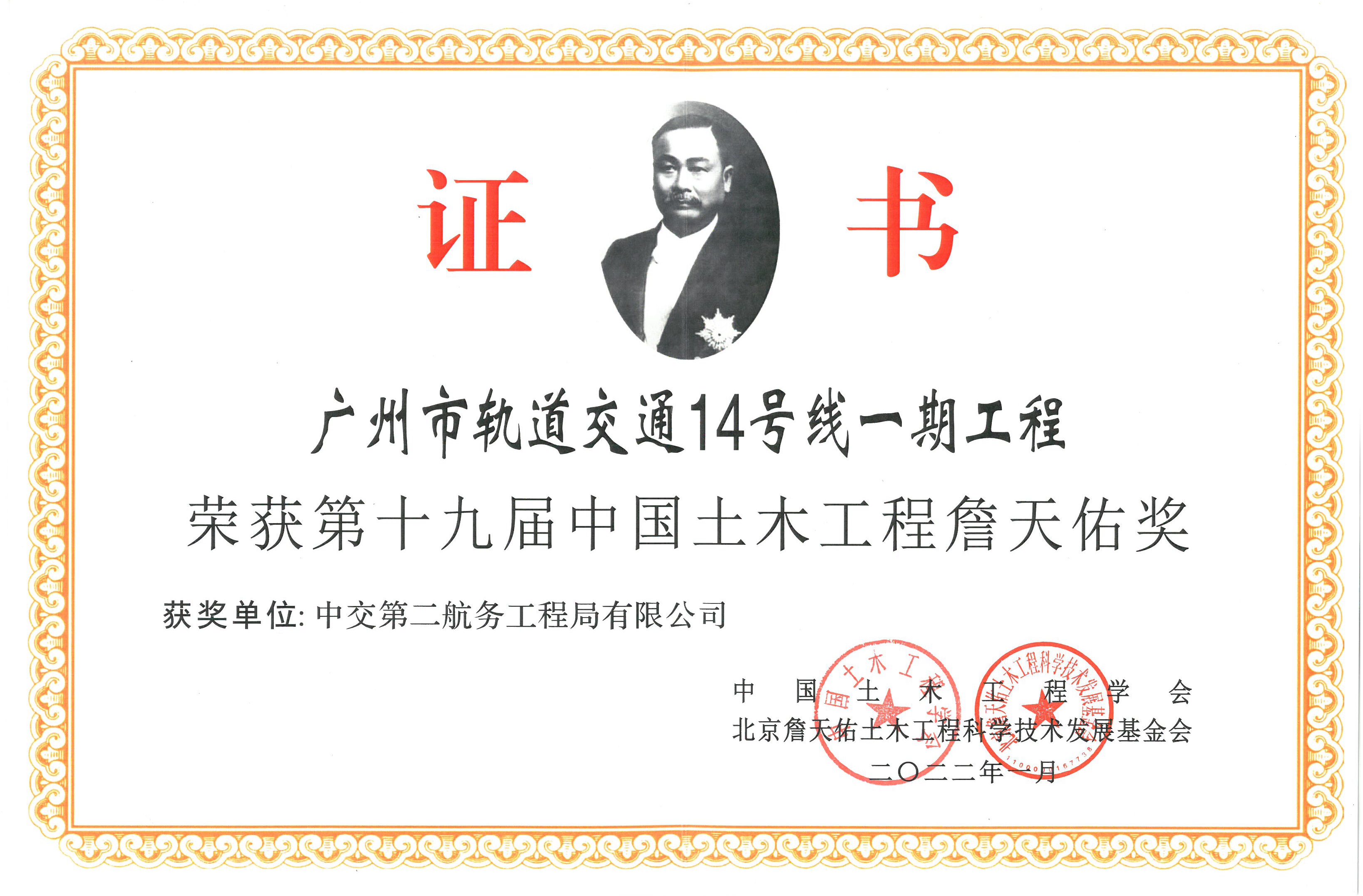 广州市轨道交通14号线一期工程荣获第十九届中领土木匠程詹天佑奖
