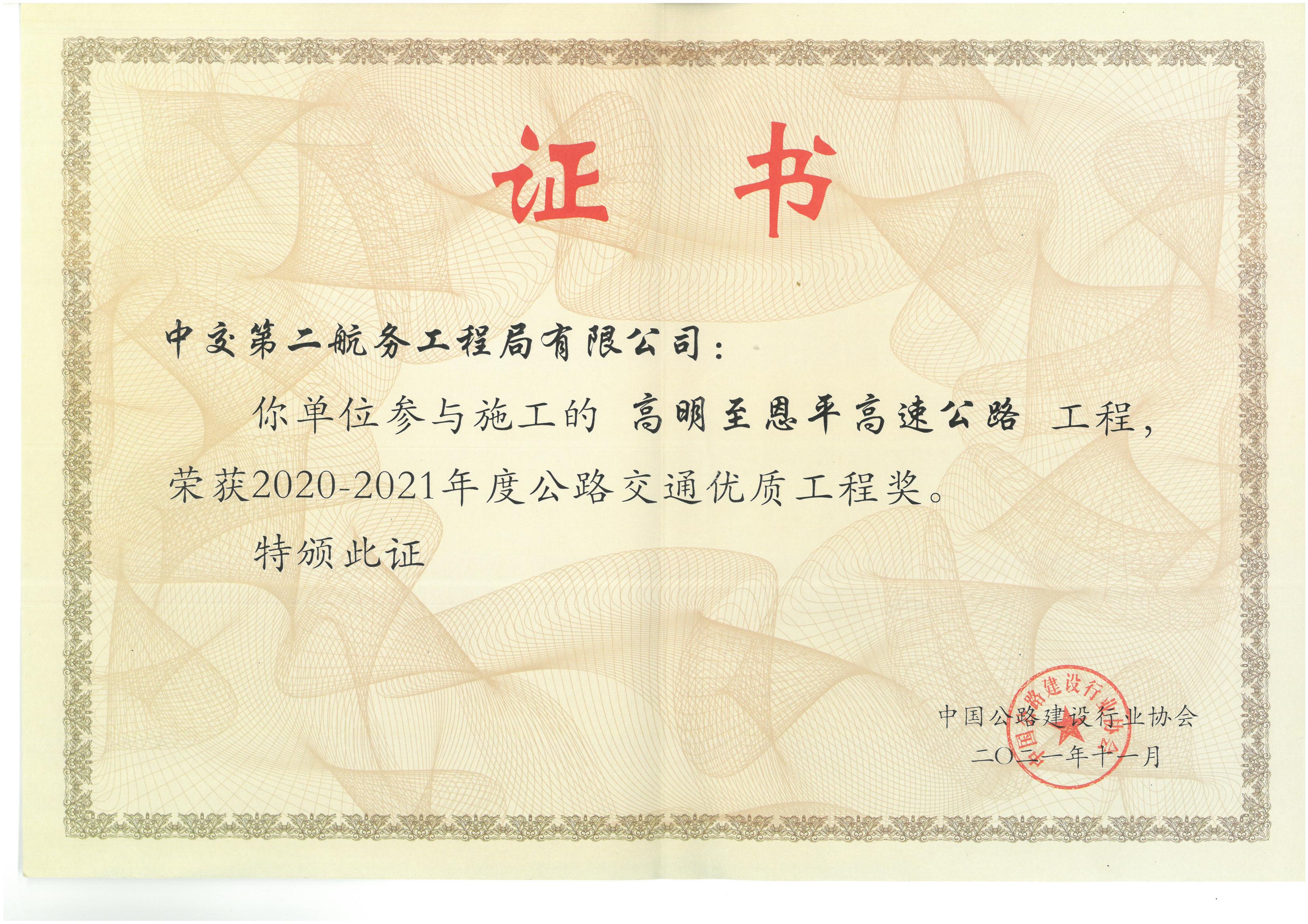 高明至恩平高速公路工程获2020-2021年度公路交通优质工程奖