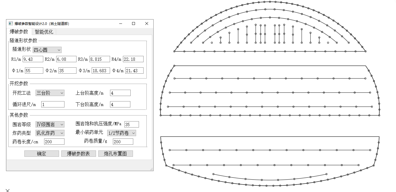 在钻爆法隧道施工中,,,,,,,,由于地质条件重大,,,,,,,,爆破设计和施工手艺不规范等因素,,,,,,,,导致爆破效果不睬想,,,,,,,,超挖量大。。。。。研究团队从现在现场炮孔放样数目少、炮孔位置精度低,,,,,,,,爆破设计不可实时输出调解等现场现实问题出发,,,,,,,,自主研发了隧道爆破辅助设计系统,,,,,,,,该系统可通过输入隧道断面尺寸、开挖参数及炸药参数等,,,,,,,,一键天生爆破参数表和炮孔安排图;;;;;;;;研发了隧道全炮孔激光自动一次定位装置,,,,,,,,该装置可将天生炮孔安排图一次精准地投影至隧道掌子面,,,,,,,,大幅节约现场放样时间并包管炮孔放样精度,,,,,,,,一定水平上提升现场爆破效果。。。。。