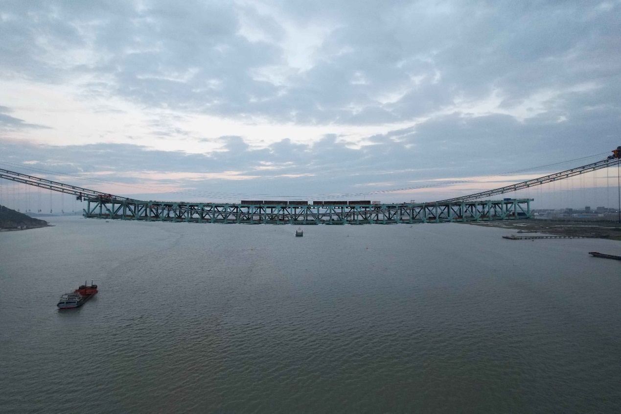 据悉,,,,,,温州瓯江北口大桥项目是甬台高速公路复线和温州市南金公路两大项目的控制性工程,,,,,,全长7.913公里。。。。。其中,,,,,,跨越瓯江的主桥总长为2090m,,,,,,是天下首座三塔四跨双层钢桁梁悬索桥,,,,,,共包括110榀钢桁梁。。。。。受航空限高和桥下通航净空影响,,,,,,主桥两个主跨跨中约300m规模保存缆梁相交区,,,,,,即主缆高度低于主梁。。。。。现阶段项目施工的焦点使命是主桥钢桁梁吊装,,,,,,现在已完成总体吊装进度的35%。。。。。全桥钢梁吊装工艺极其重大,,,,,,尤其关于缆梁相交区钢桁梁装置而言,,,,,,常用的缆载吊机吊装工艺无法直接将钢梁吊装到位,,,,,,需探索全新的施工工艺。。。。。