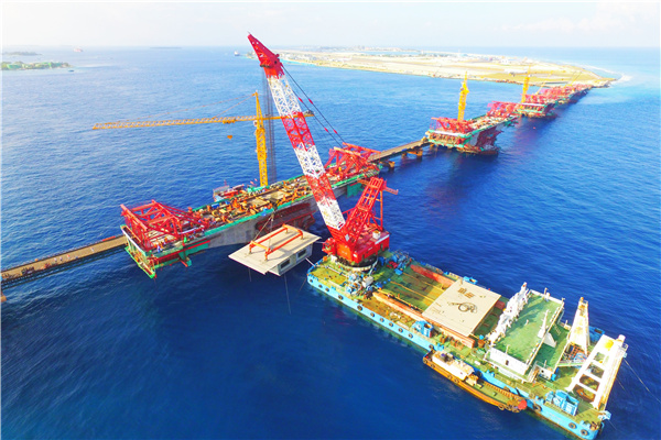 中马友谊大桥主桥上部结构接纳混凝土梁与钢-UHPC叠合梁,,,,,,,,混凝土梁与钢箱梁之间设置有钢混讨论。。。。。。其中钢箱梁节段由海力801吊装至墩顶后,,,,,,,,举行拼装、顶推、配切合龙,,,,,,,,钢混团结段由桥面吊机从甲板驳上提升,,,,,,,,并与已浇筑的混凝土梁毗连。。。。。。