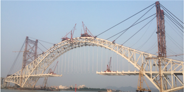该发明的原理是预先思量主桁拱合龙时状态,,,,,在钢梁初始架设时边支点预降一定量,,,,,钢梁绕主墩支座转动,,,,,使合龙口预抬,,,,,消除合龙口转角误差,,,,,同时钢梁向跨中预偏一定量,,,,,消除合龙口纵向误差,,,,,合龙时仅需对边支点升降微调即可实现主桁拱无应力合龙。。。。。。。。相比以往接纳斜拉扣挂悬臂法施工的大跨钢桁拱桥主拱合龙施工,,,,,不需顶推和顶升主墩支座,,,,,也不需调解扣索索力,,,,,简化了施工工艺,,,,,大大降低了施工危害,,,,,节约了工期,,,,,确保了却构清静,,,,,社会和经济效益十分显著。。。。。。。。(周仁忠)