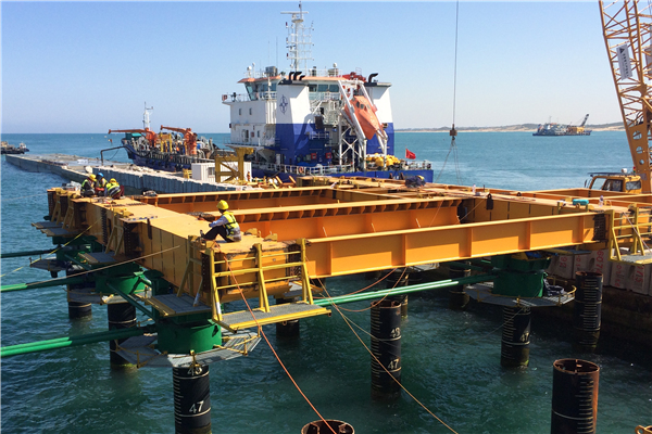 项目部凭证现场情形,,,,,,转变思绪,,,,,,提出变水上施工为陆上施工的起源计划。。。。。。。优德88官网网站二航局手艺中心专家团队开动头脑,,,,,,翻开思绪,,,,,,最终将桥梁自平衡液压顶推工艺引进至水工打桩领域,,,,,,经武港院设计团队举行结构详细设计,,,,,,最终研制出具有自主知识产权的桩顶活动式液压顶推打桩平台。。。。。。。经现场实践,,,,,,该平台不受海浪影响,,,,,,可全天候作业,,,,,,清静可靠,,,,,,工效高而稳固,,,,,,166天,,,,,,天天事情10小时,,,,,,完成了590根超长钢管桩的施工,,,,,,成为二航局外海条件下桩基施工的典范案例。。。。。。。(冯先导)