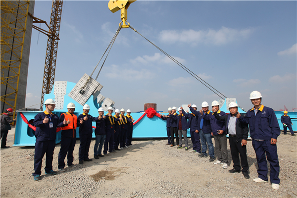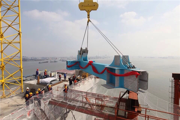 10月21日上午10点28分,,,,,在震耳欲聋的鞭炮声中,,,,,沪通长江大桥HTQ-1标段首件天酞蓝色钢桁梁,,,,,系着红彩绸,,,,,被MD3600巨型塔吊徐徐提起,,,,,水上正桥首跨简支钢桁梁最先装置,,,,,拉开了钢桁梁架设的序幕。。。。。。。。此次首件钢桁梁的吊装不但仅标记着沪通长江大桥HTQ-1标段周全进入上部结构施工阶段,,,,,还充分展现了手艺中心在公铁两用桥梁施工方面手艺服务的实力。。。。。。。。